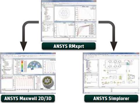● 求解后,ANSYS RMxprt模型可以自動生成更精確的電磁場有限元分析(ANSYS Maxwell)的2D或3D模型,自動生成電路仿真器(ANSYS Simplorer)等效電路模型,用于控制系統設計,將ANSYS RMxprt生成的設計模型無縫集成到高級的設計環境。